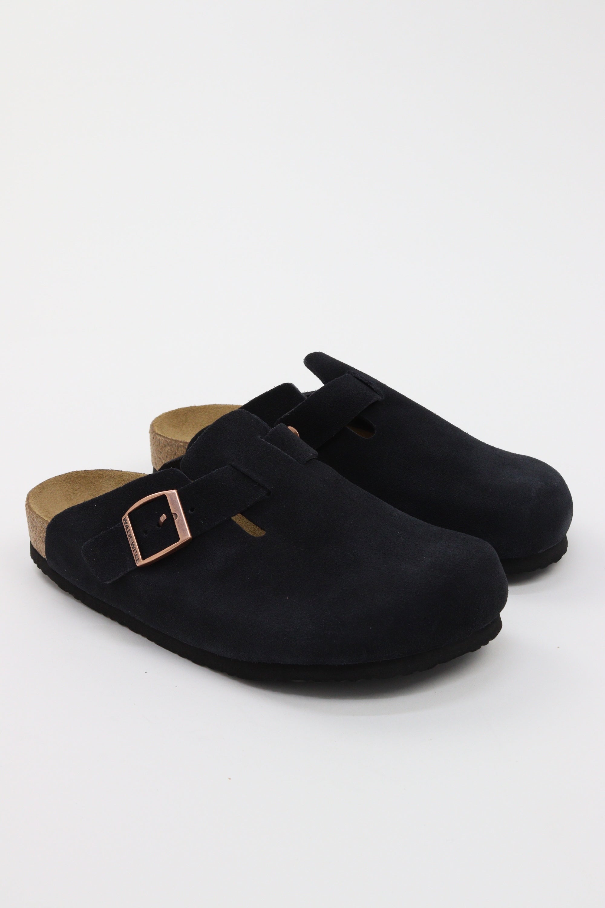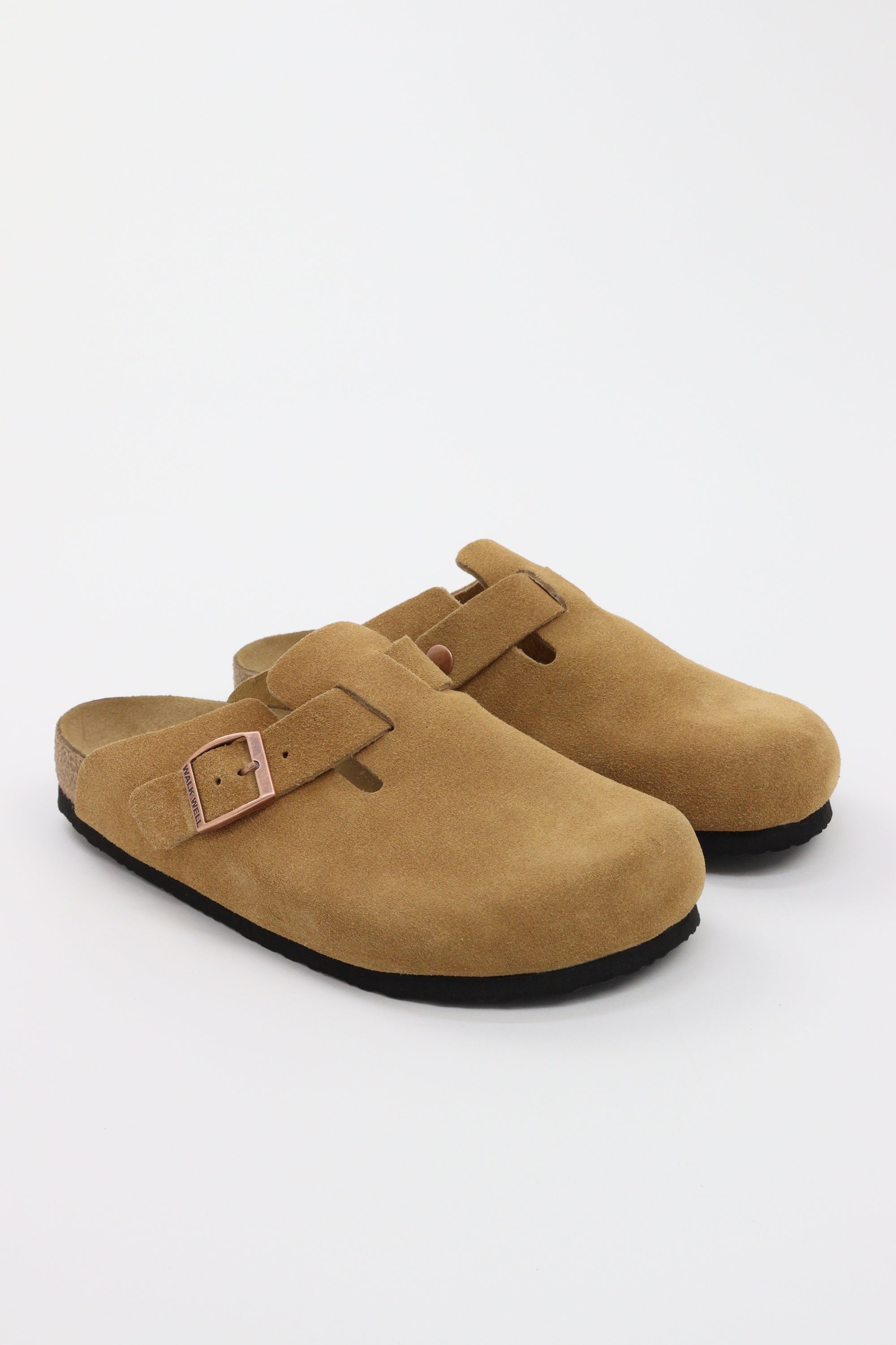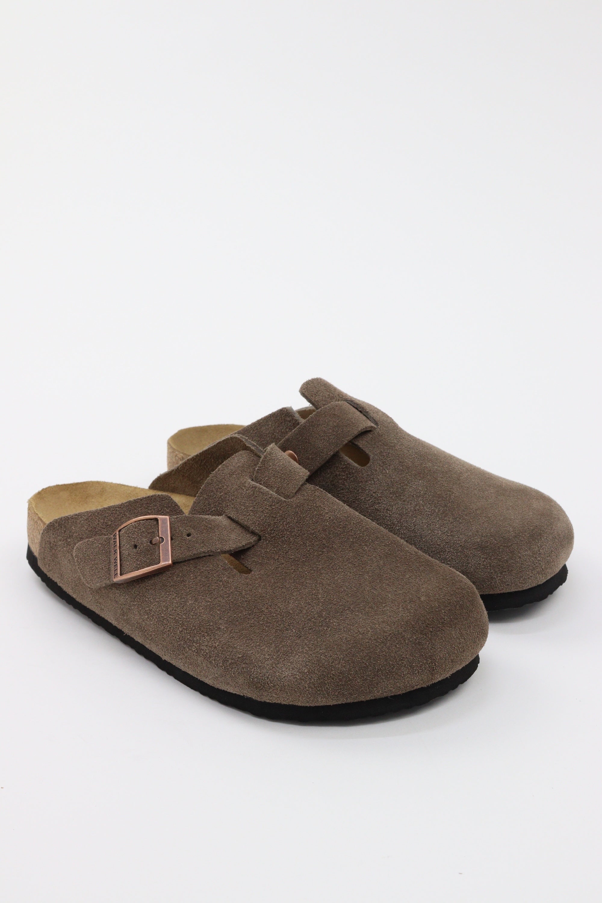 Genuine suede leather upper with a natural cork sole and soft padding + arch support.